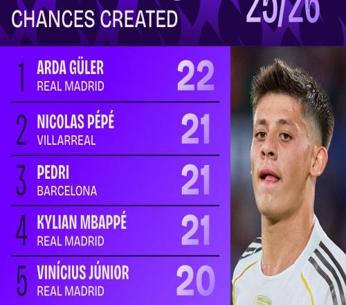 本赛季西甲创造机会榜:居莱尔22次居首,佩佩、佩德里21次